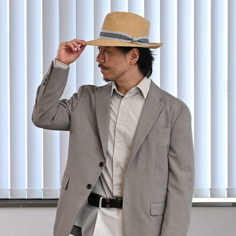 いい意味で本パナマらしくない独自の帽体カラーについ目が行きがちですが、ライトグレーのリボンもいい仕事をしていると思いますね。ドット柄のようでもあり、ストライプ柄のようでもあるこのリボンが、ちょうどいいバランスで帽体の存在感を引き立てています。