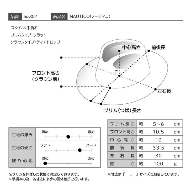 クラウントップはティアドロップ型ですが、全体の質感がややかっちりハードに仕立てられているため、人によってはかぶり心地が浅めに感じられるかもしれません。試着して選ぶことをおすすめします。より合わせ編みのパナマハットなので、涼しいのが魅力ですね。