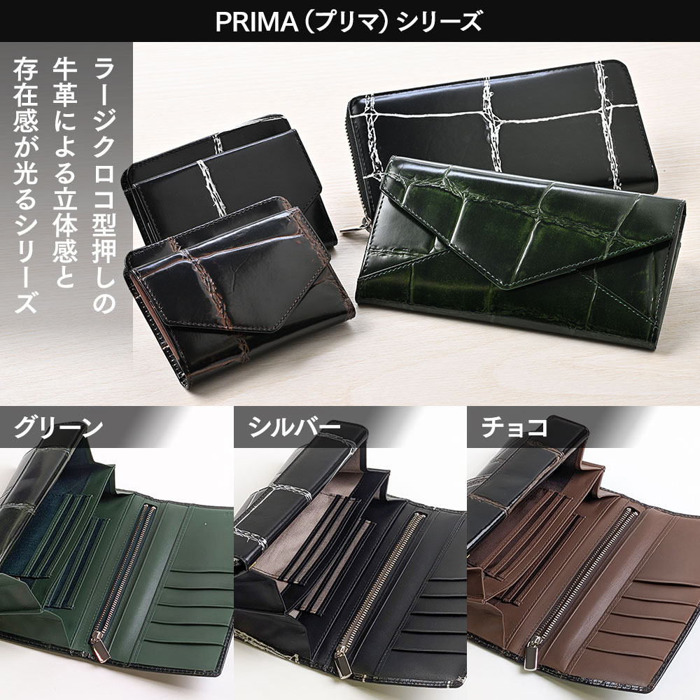 PRIMA(プリマ)シリーズは、ラージクロコ型押しの牛革を用い、立体感と落ち着きを両立した表情で、日常使いに適した実用性と確かな存在感を備えています。