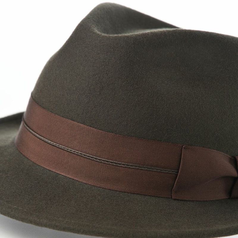トップのツマミのシルエットが美しく、凝ったライン入りのリボンも映える、ブランド定番のウールフェルトハット。フィット感の良さと総裏地仕立ての高級感も大きな魅力。