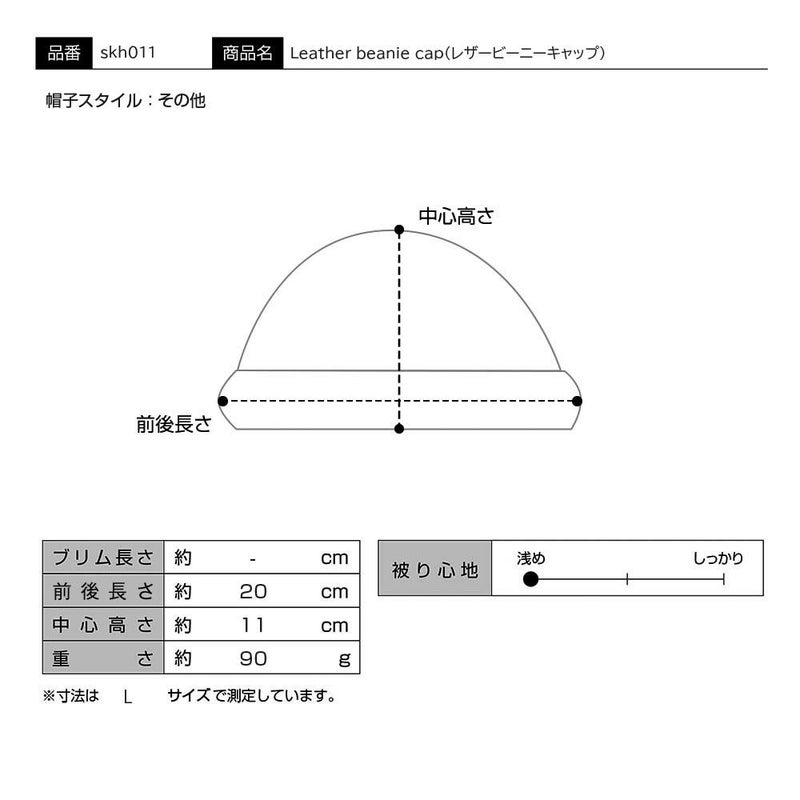 また、ニット帽の分野では、このような半円形のフォルムで、頭の形にぴったりと合う形状の帽子をビーニーキャップと呼ぶ場合があり、このLeather beanie cap(レザービーニーキャップ)という商品名はそれに由来するものになります。