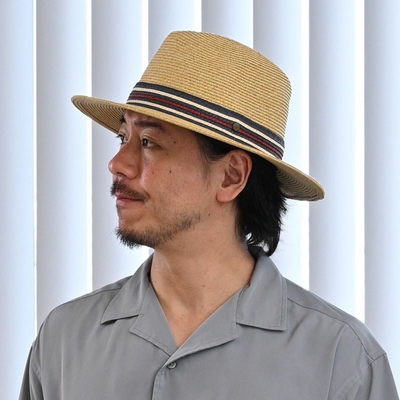 ソフトな仕立てでフィット感も悪くない、フラットなロングブリムのブレードハット。リボン部分は、別色に染めた同素材のブレードを組み合わせた、立体的なストライプ。