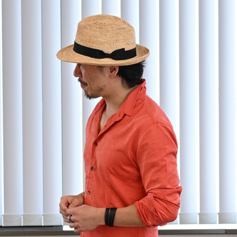 帽体の素材は、天然のラフィアです。ラフィアとは、マダガスカル島原産のラフィア椰子(やし)という植物の葉からとった繊維を乾燥させて、白っぽい紐状に加工した素材のこと。天然のろう分と油脂分を多く含み、なめらかで柔らかいことが特徴になります。