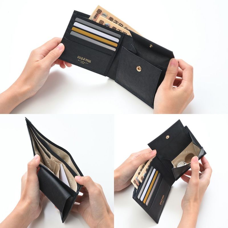 メタルの装飾は、日本の最上級職人によるメッキと磨きが施された、信頼と品質の象徴です。すっきりコンパクトなデザインながら、十分な収納力のある二つ折り財布になっています。