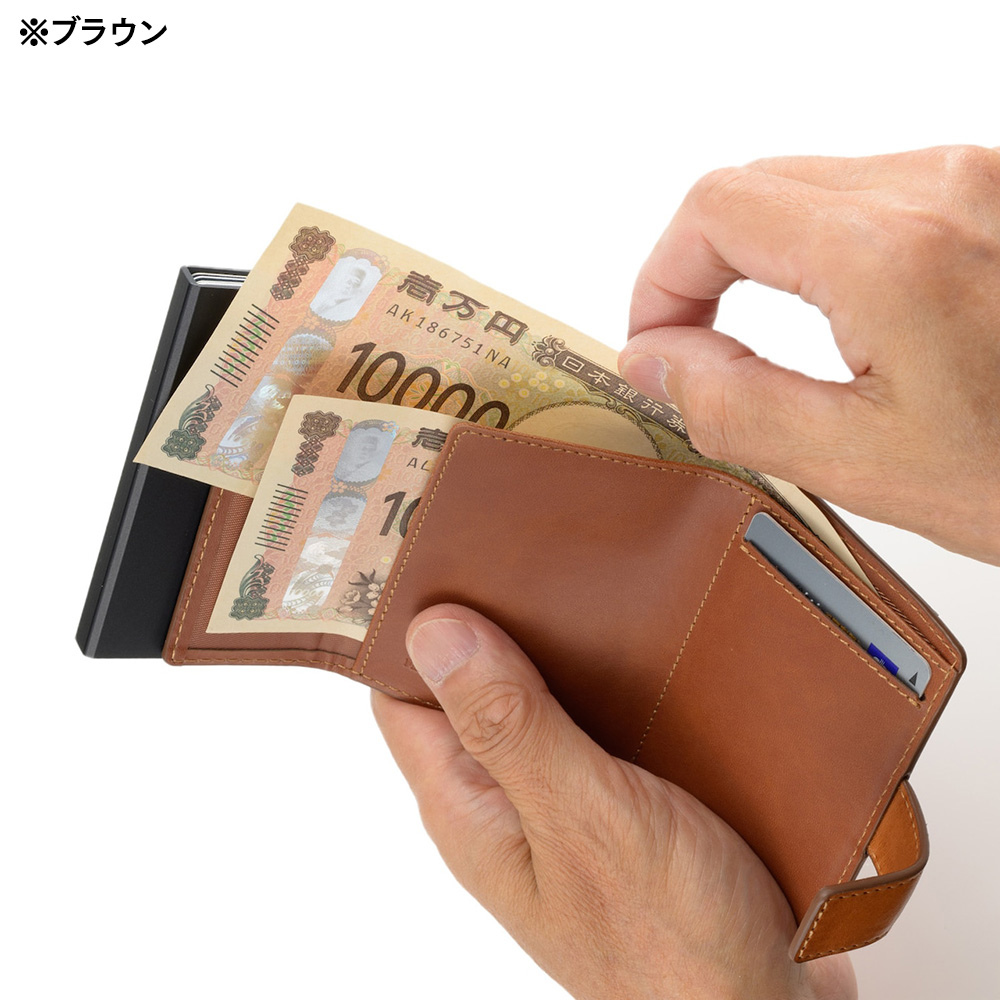 上質なイタリアンレザーを素材に用いた、三つ折りの札入れ。スライド式で中身を取り出しやすい、便利で安心なアルミカードケース付き。