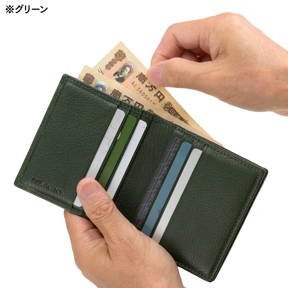 牛革を素材に、柔らかさとシワ感を引き出すミリング加工で仕上げた、二つ折り財布。お札を簡単に取り出せる、便利なマネースルー機能付き。