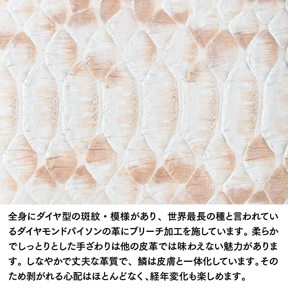 全身にダイヤ型の斑紋・模様があり、世界最長の種と言われているダイヤモンドパイソンの革にブリーチ加工を施しています。 柔らかでしっとりとした手ざわりは他の皮革では味わえない魅力があります。 しなやかで丈夫な革質で、鱗は皮膚と一体化しています。そのため剥がれる心配はほとんどなく、経年変化も楽しめます。