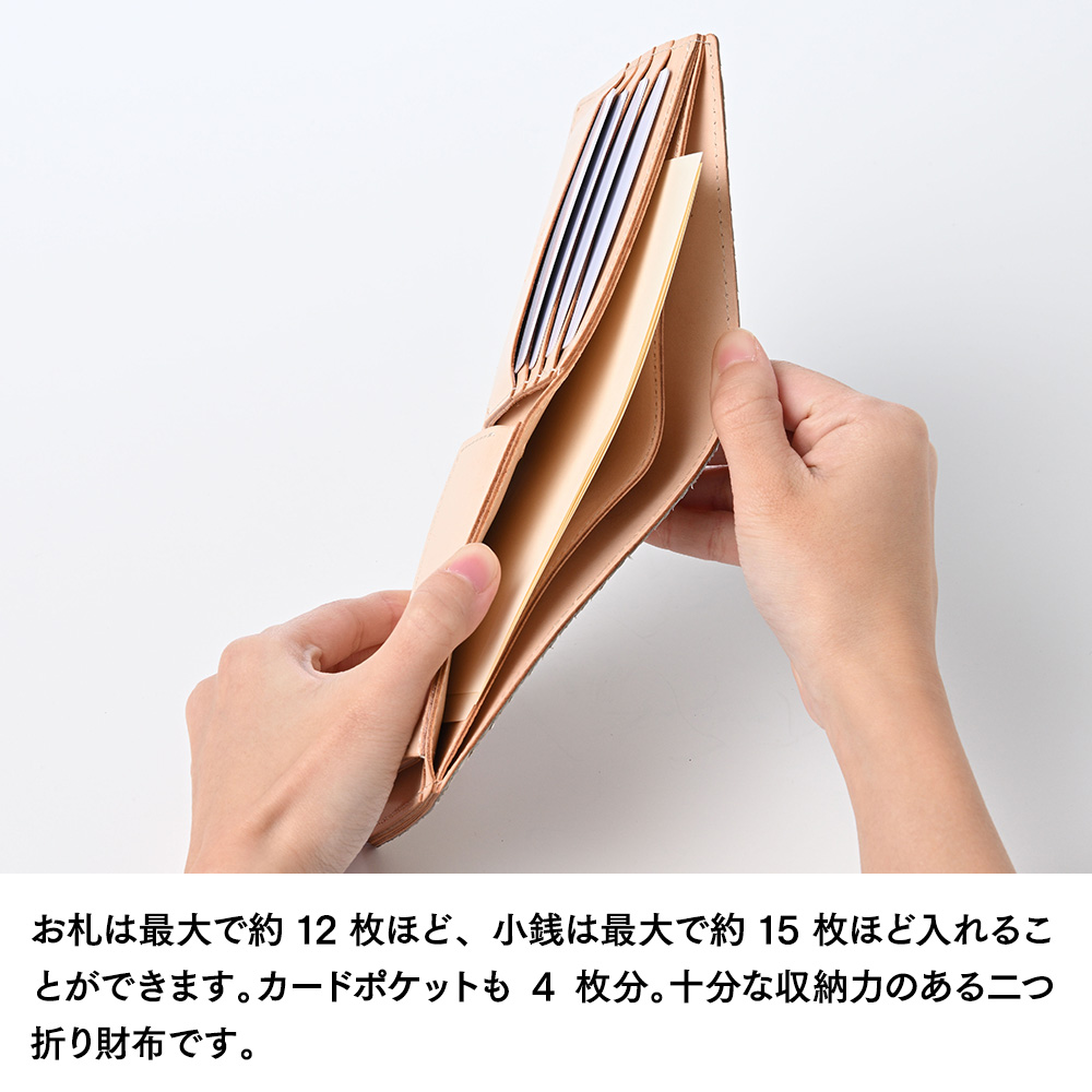 お札は最大で約12枚ほど、小銭は最大で約15枚ほど入れることができます。カードポケットも4枚分。十分な収納力のある二つ折り財布です。