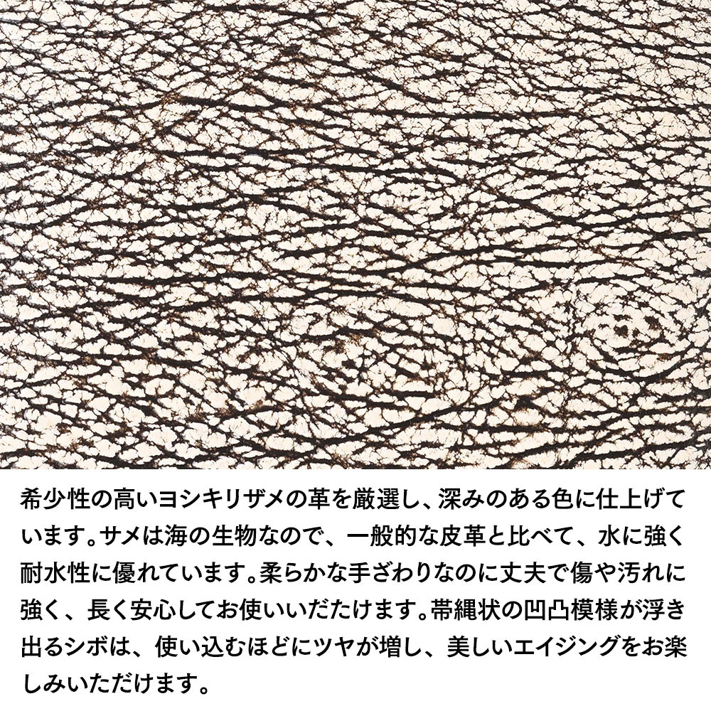 希少性の高いヨシキリザメの革を厳選し、深みのある色に仕上げています。サメは海の生物なので、一般的な皮革と比べて、水に強く耐水性に優れています。柔らかな手ざわりなのに丈夫で傷や汚れに強く、長く安心してお使いいだたけます。帯縄状の凹凸模様が浮き出るシボは、使い込むほどにツヤが増し、美しいエイジングをお楽しみいただけます。
