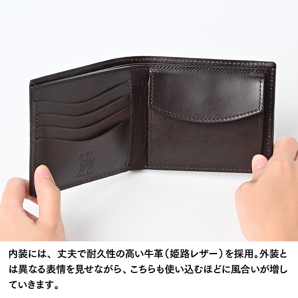 内装には、丈夫で耐久性の高い牛革(姫路レザー)を採用。外装とは異なる表情を見せながら、こちらも使い込むほどに風合いが増していきます。