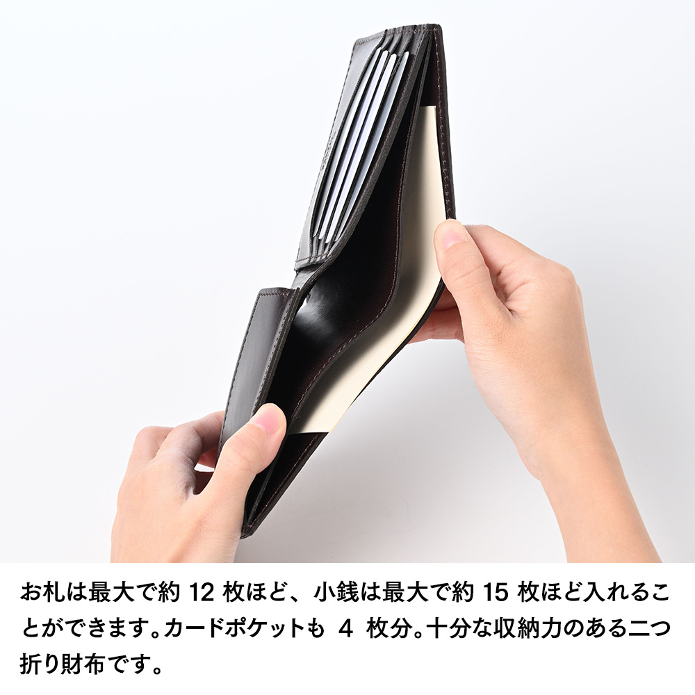 お札は最大で約12枚ほど、小銭は最大で約15枚ほど入れることができます。カードポケットも4枚分。十分な収納力のある二つ折り財布です。