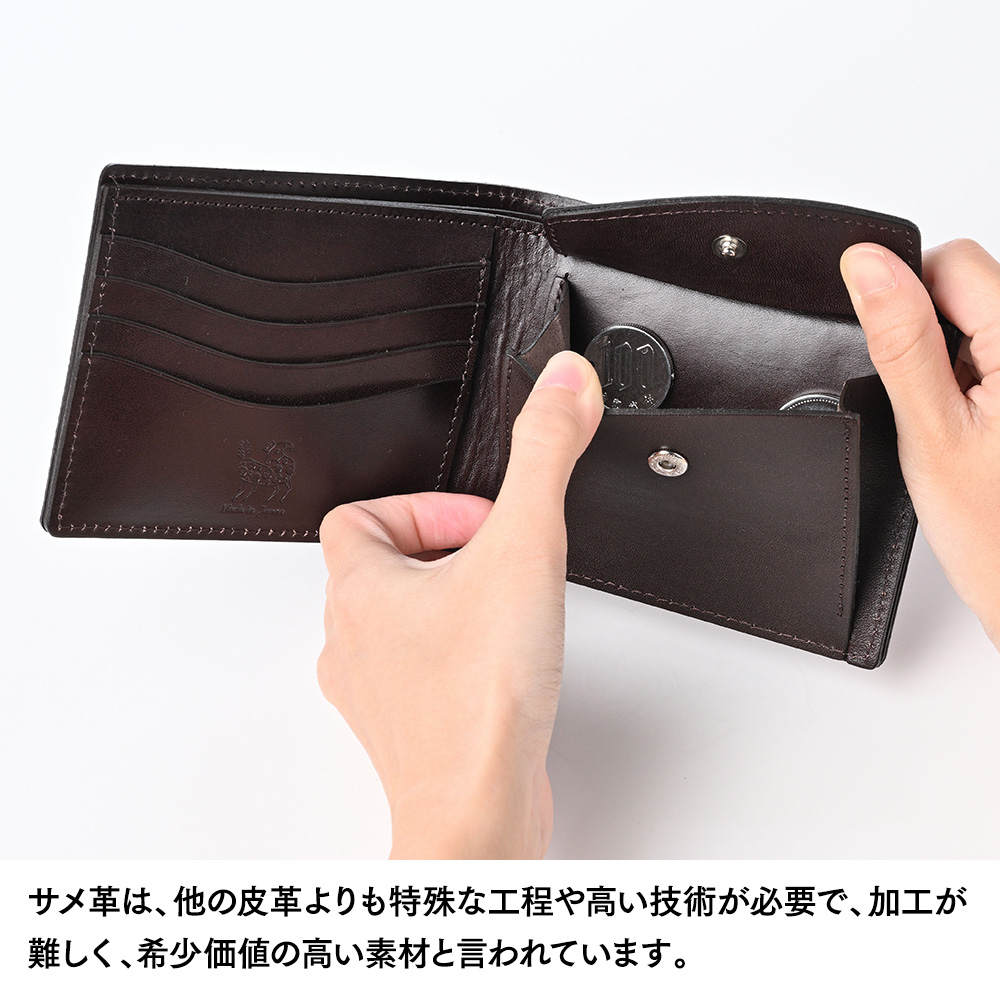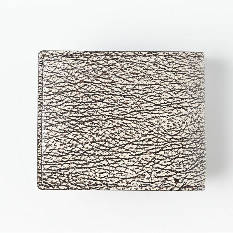 希少性の高いヨシキリザメ革を使用した二つ折り財布、表面に網目状の凹凸がある独特の質感が魅力