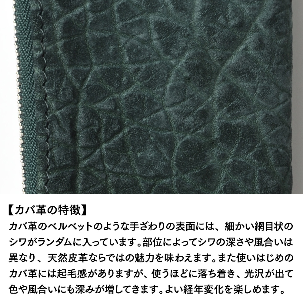 カバ革は耐久性にも優れているため、水や油汚れなどに十分注意することで長くお使いいただけます。また使いはじめのカバ革には起毛感がありますが、使うほどに落ち着き、光沢が出て色や風合いにも深みが増してきます。よい経年変化を楽しめる一品です。