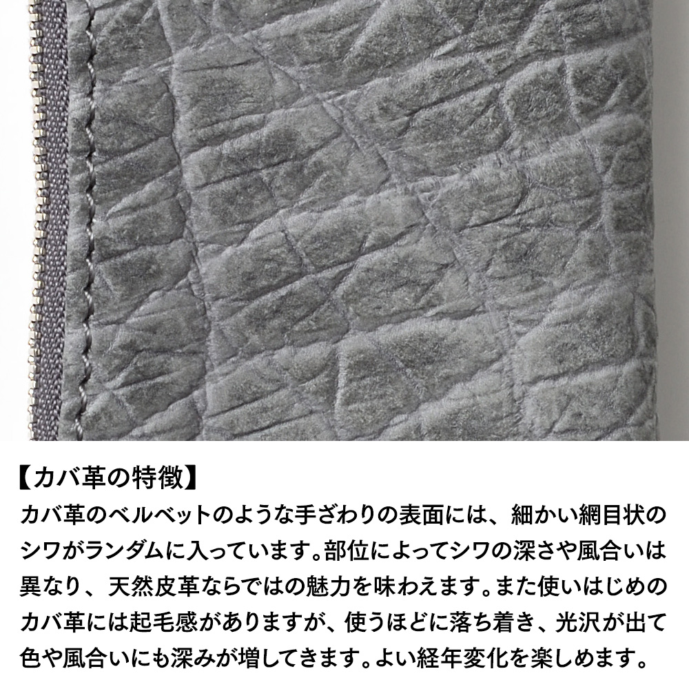 カバ革は耐久性にも優れているため、水や油汚れなどに十分注意することで長くお使いいただけます。また使いはじめのカバ革には起毛感がありますが、使うほどに落ち着き、光沢が出て色や風合いにも深みが増してきます。よい経年変化を楽しめる一品です。