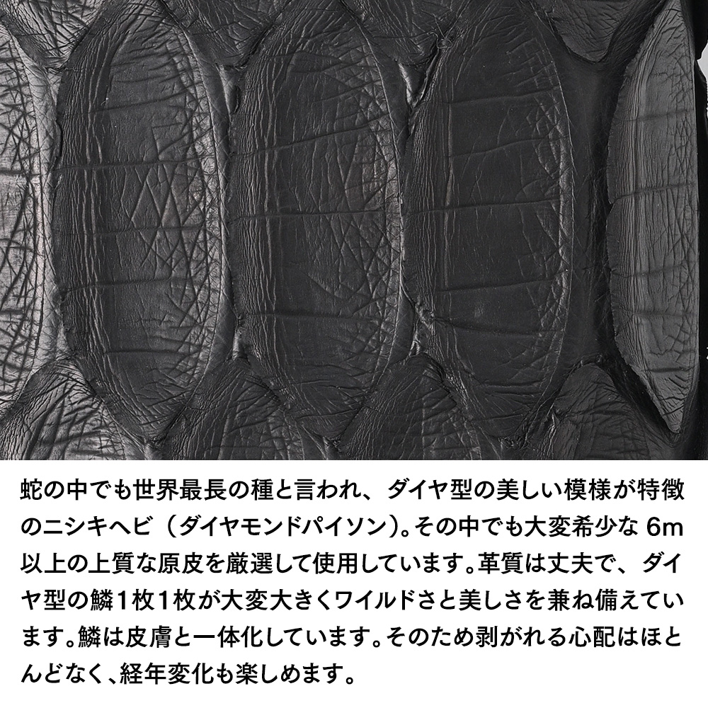 蛇の中でも世界最長の種と言われ、ダイヤ型の美しい模様が特徴のニシキヘビ(ダイヤモンドパイソン)。その中でも大変希少な6m以上の上質な原皮を厳選して使用しています。革質は丈夫で、ダイヤ型の鱗1枚1枚が大変大きくワイルドさと美しさを兼ね備えています。鱗は皮膚と一体化しています。そのため剥がれる心配はほとんどなく、経年変化も楽しめます。