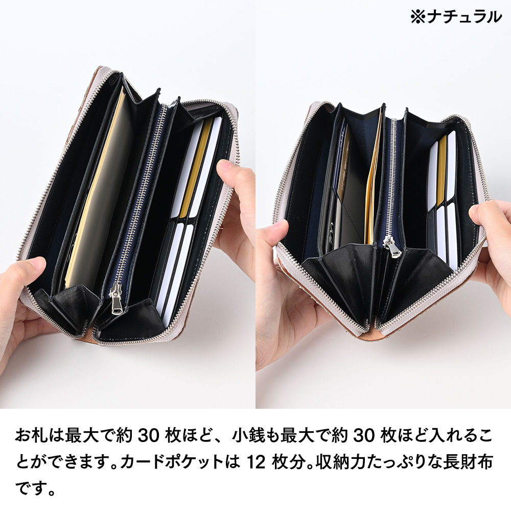 お札は最大で約30枚ほど、小銭も最大で約30枚ほど入れることができます。カードポケットは12枚分。収納力たっぷりな長財布です。