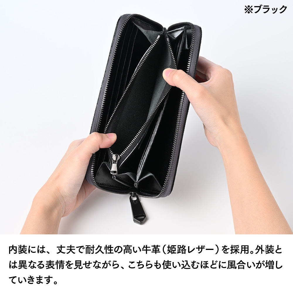 内装には、丈夫で耐久性の高い牛革(姫路レザー)を採用。外装とは異なる表情を見せながら、こちらも使い込むほどに風合いが増していきます。