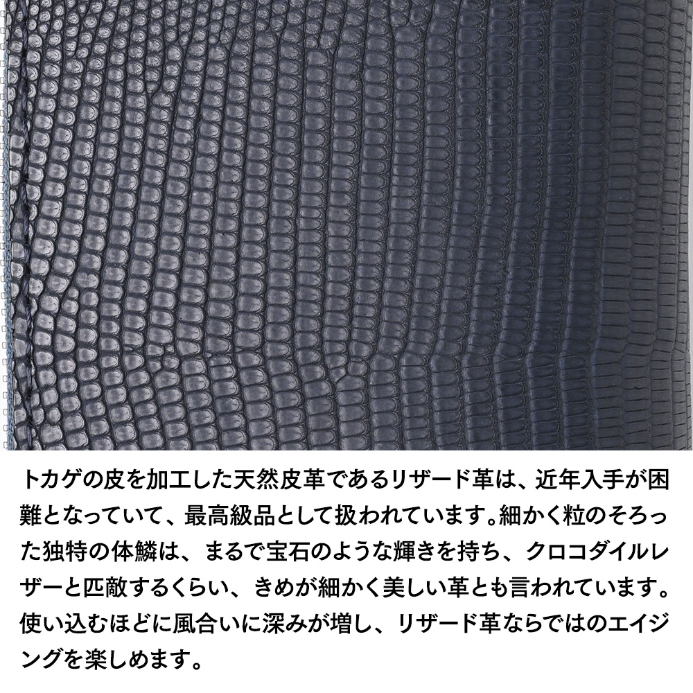 トカゲの皮を加工した天然皮革であるリザード革は、近年入手が困難となっていて、最高級品として扱われています。細かく粒のそろった独特の体鱗は、まるで宝石のような輝きを持ち、クロコダイルレザーと匹敵するくらい、きめが細かく美しい革とも言われています。使い込むほどに風合いに深みが増し、リザード革ならではのエイジングを楽しめます。