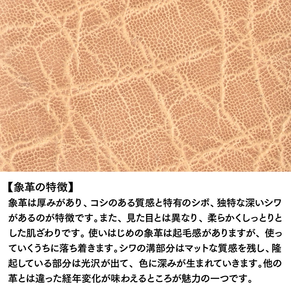 ワシントン条約の規制下にある象革は、数ある皮革の中でも極めて希少価値の高い素材です。ZOO(ズー)では、特に質感や模様が豊かな“鼻・ショルダー・背中”といった貴重部位のみを厳選して使用しています。深く刻まれた独特のシワや立体的なシボ感は、唯一無二の表情を見せ、使い込むほどに色味と光沢が増し、革の奥行きが育っていきます。