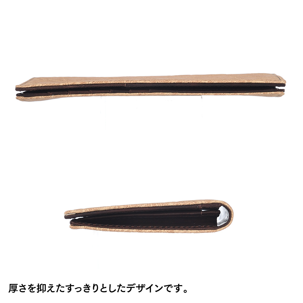 厚みとコシのあるしっかりした質感ながら、触れると驚くほどしなやかで滑らか。耐久性・耐摩耗性に優れており、長年の使用にも安心感があります。日常使いの札入れとして、実用性と個性を兼ね備えています。厚さを抑えたすっきりとしたデザインです。