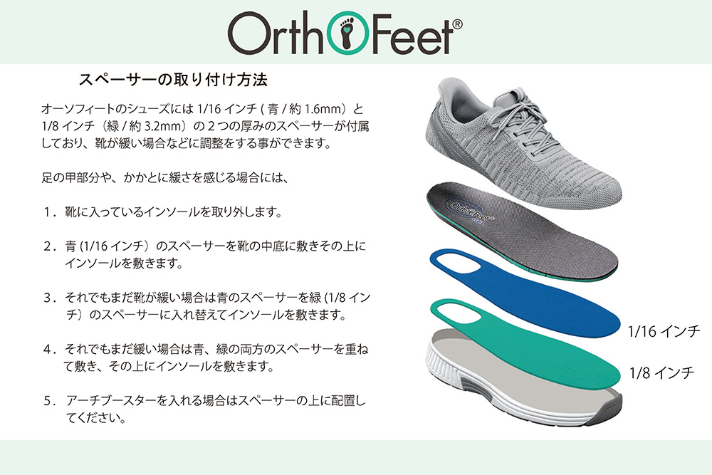 初めてご使用の時は、アーチブースターもスペーサー2枚も全て入れてみて下さい。「きつすぎる」と感じた場合には、減らしていくことで調整をすることお勧めします。