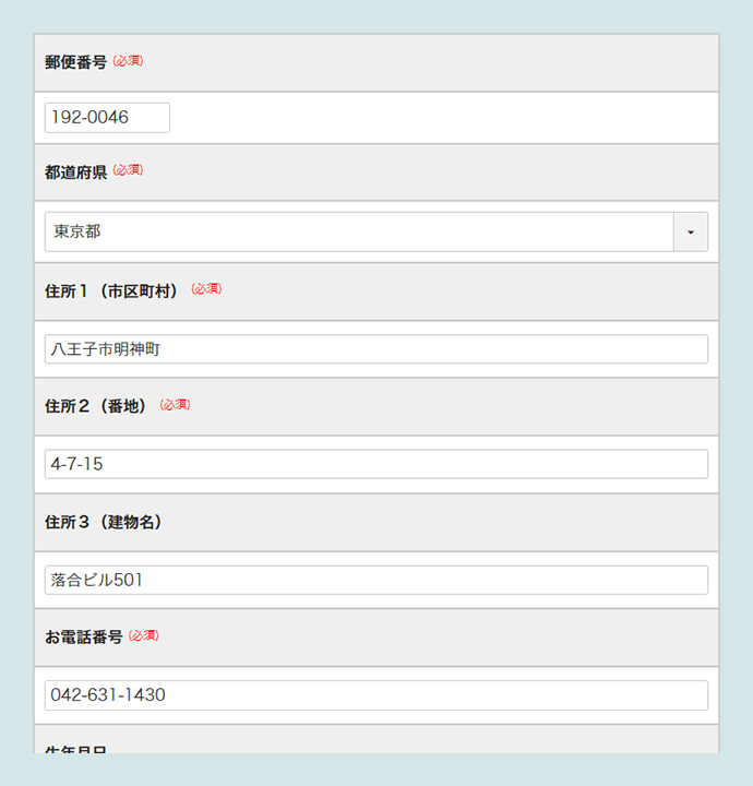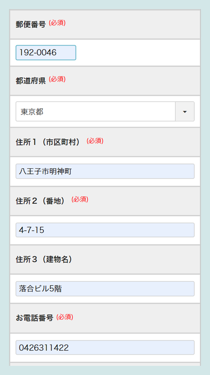 「郵便番号」「都道府県」「住所1(市区町村)」「住所2(番地)」「住所3(建物名)」を入力します。