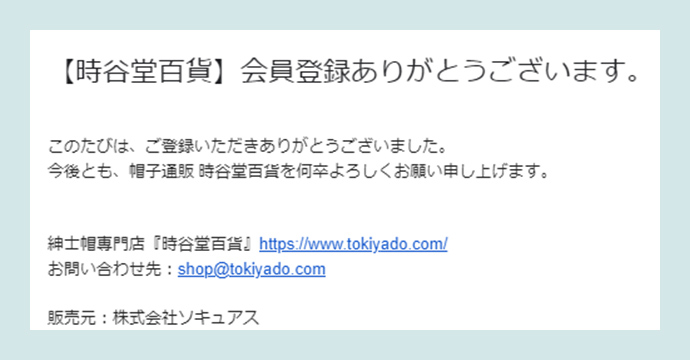 「ご登録メールアドレス」宛てに、【時谷堂百貨】から会員登録が完了した旨のメールが届きますのでご確認ください。
