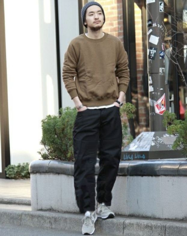 - ニット帽とスニーカーの色を合わせて、メリハリをつけている