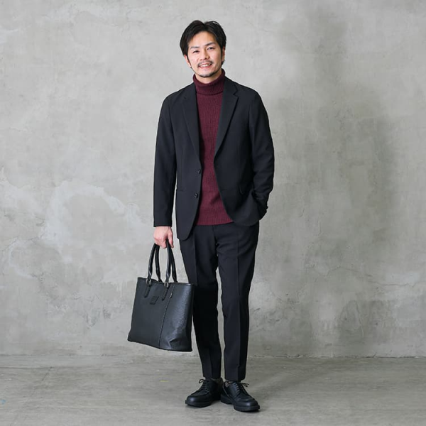 - タートルネックやジャケット、革靴で上品にまとめている