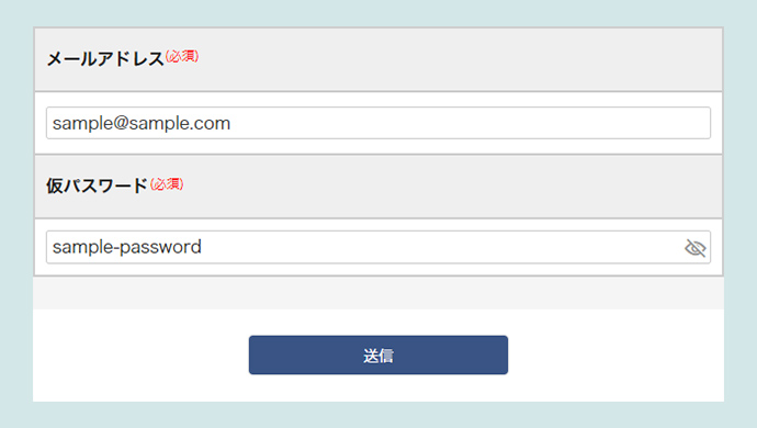 パスワード再設定フォームに、会員登録時に利用した「ご登録メールアドレス」と「仮パスワード」を入力します。
