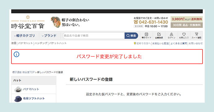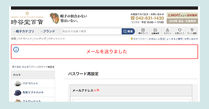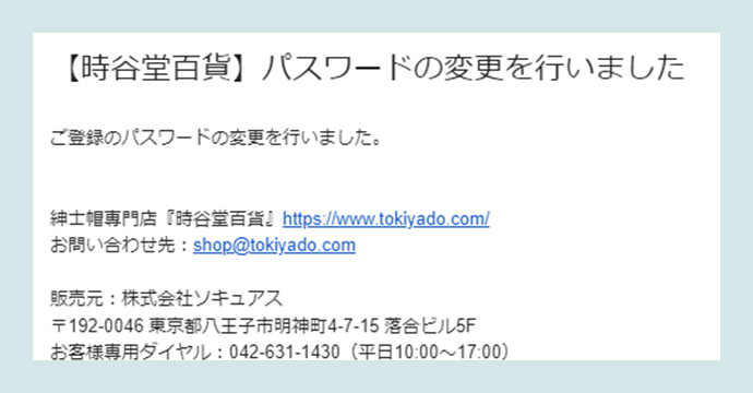「ご登録メールアドレス」宛てに、【時谷堂百貨】からパスワードの変更が完了した旨のメールが届きますのでご確認ください。